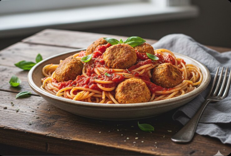 Pasta mit veganen Protein-Bällchen