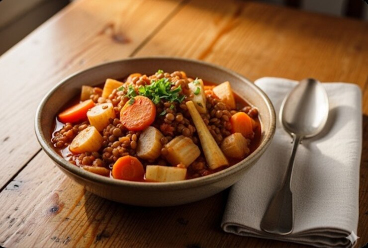 Ein kräftiger, wärmender Eintopf mit Linsen, Karotten, Sellerie und Pastinaken.