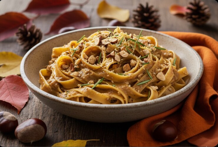 Cremige Marroni-Sauce mit Rosmarin und Zitronenfrische auf al-dente-Pasta – ein feines, nussiges Herbstgericht.