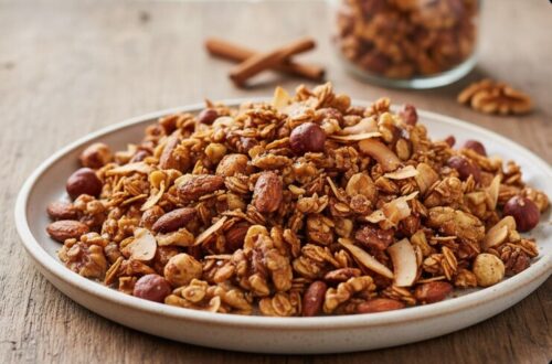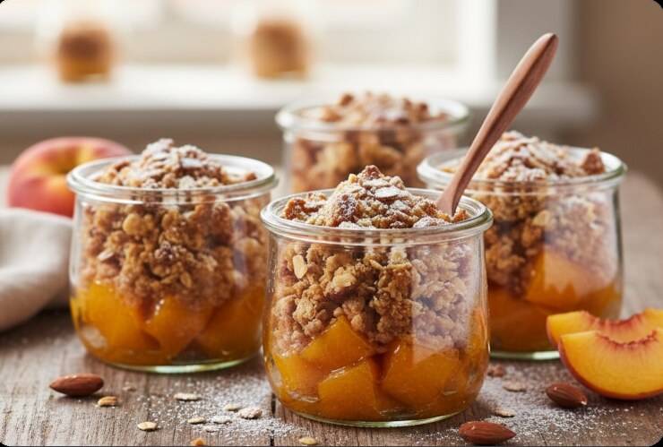 Saftige Pfirsiche mit knusprigen Haferstreuseln – süß, aber leicht.