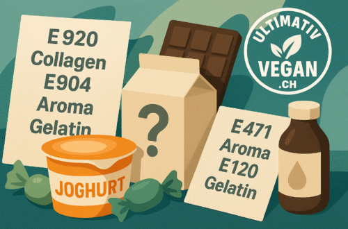 - Auf Zusatzstoffe achten: E120 (Karmin → nicht vegan), E471 (pflanzlich ODER tierisch → in der CH meist pflanzlich).