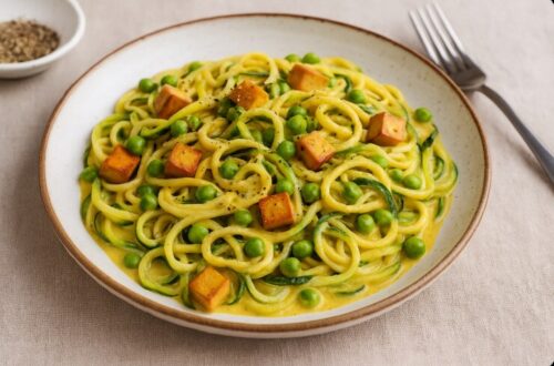 Feine Zoodles in cremiger Kürbissauce mit Muskat und Zitronensaft – leicht und sättigend.