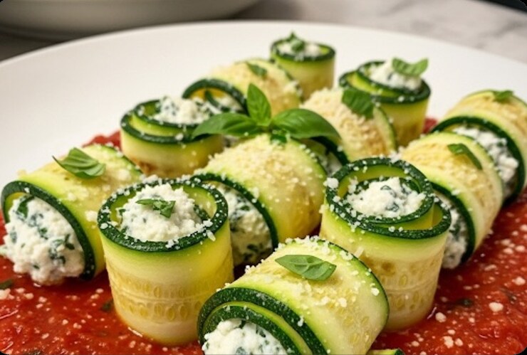 Zucchini-Ricotta-Röllchen auf Tomatensauce